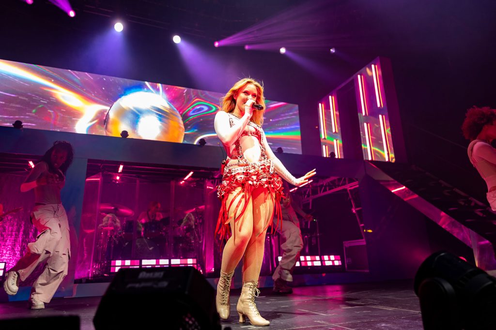 The set starts with Zara appearing via a magic trick before she quickly gets stuck into 'Venus'' sleek title-track. An upbeat number about the otherworldly feeling of falling in love, it perfectly sets up the show's overarching message of losing yourself in music and community. The tropical pop shimmer of 'I Would Like' and the chirping, ABBA-inspired 'Look What You've Done' continue that glittering getaway. "I hope you put on your dancing shoes tonight, London," says Zara. "And I hope you're ready to get hot and sweaty. Let's escape to planet Venus."